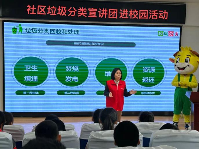 活動(dòng)開(kāi)始前,工作人員為學(xué)校的孩子們分發(fā)了垃圾分類(lèi)宣傳彩頁(yè),并結(jié)合PPT以及垃圾分類(lèi)宣傳彩頁(yè),通過(guò)風(fēng)趣幽默的講解,讓同學(xué)們?cè)谛β曋辛私馐裁词抢诸?lèi)、垃圾分類(lèi)的現(xiàn)狀、垃圾分類(lèi)的意義、如何垃圾分類(lèi)、垃圾分類(lèi)誤區(qū)等內(nèi)容。宣傳講解員還重點(diǎn)講解了生活垃圾四分類(lèi)和生活垃圾類(lèi)別,梳理了垃圾分類(lèi)的標(biāo)準(zhǔn),解答大家的疑惑。孩子們熱情高漲,活動(dòng)現(xiàn)場(chǎng)氣氛十分活躍。